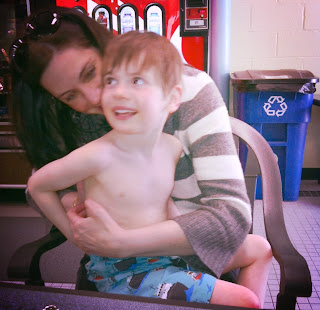 My wife and son spent a day in Baltimore, visiting her sister and nephew. First stop was swim lessons, then it was on to Duck Pin Bowling. My kid was the big winner...$5 in an arcade game won him a $100 Visa card. Yes, he's already spent it (says it was worth every penny!). After playing, it was back home for dinner and dessert, which E devoured in a single mouthful.